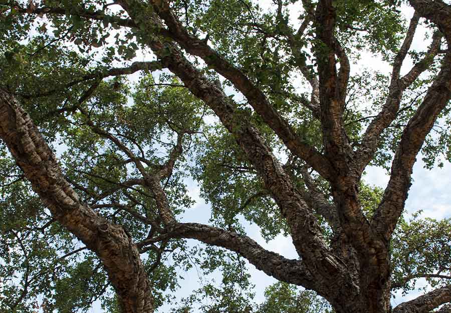 The leaf canopy of a healthy cork oak (Quercus suber), with its wonderfully craggy bark, provides green shade for visitors to The Huntington during a time of intense drought. Photograph by Lisa Blackburn.