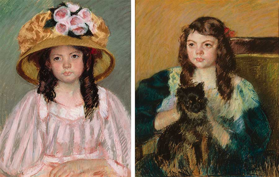 Left: Mary Cassatt, Young Girl in a Large Hat, 1908, pastel on paper, 25 1/4 x 19 1/2 in. Arabella D. Huntington Memorial Collection. The Huntington Library, Art Museum, and Botanical Gardens. Right: Mary Cassatt, Françoise Holding a Little Dog, 1908, pastel on paper, 26 7/8 x 22 3/4 in. Arabella D. Huntington Memorial Collection. The Huntington Library, Art Museum, and Botanical Gardens.