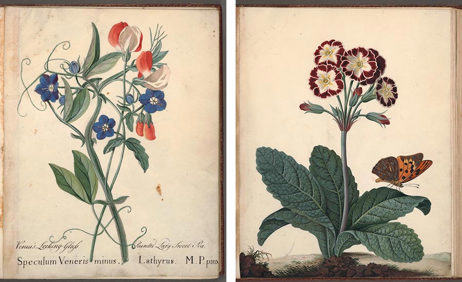 From botanical albums created by a mother and daughter, Countess Mary Macclesfield and Lady Elizabeth Parker Fane, containing 73 watercolor drawings on parchment depicting plant specimens, some drawn with butterflies and other insects. Manuscripts produced in England between 1756 and 1767. The Huntington Library, Art Museum, and Botanical Gardens.