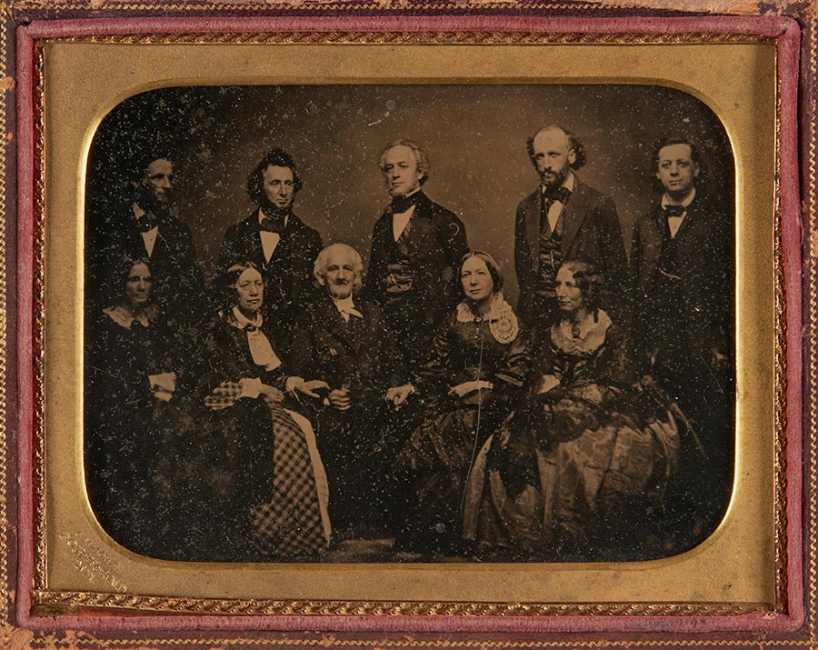 George M. Howe, The Beecher Family, ca. 1860, half plate ambrotype in case, 4 x 5 ¼ in. Harriet Beecher Stowe, author of the novel Uncle Tom's Cabin, is seated at right; her brother, abolitionist Henry Ward Beecher, stands at far right. The Huntington Library, Art Museum, and Botanical Gardens.