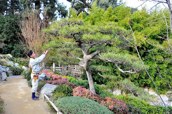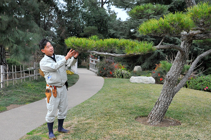 During his annual pruning visit to The Huntington’s Japanese Garden, Yamada noticed that the branches of the black pine (Pinus thunbergii) near the teahouse were looking too much like a big bonsai. Photo by Andrew Mitchell.