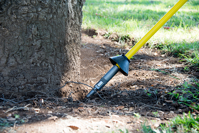 Over time, soil accumulates around a tree’s trunk, cutting off the air supply. Help is on the way, in the form of an air spade attached to an air compressor, seen here in the background. Photo by Kate Lain.
