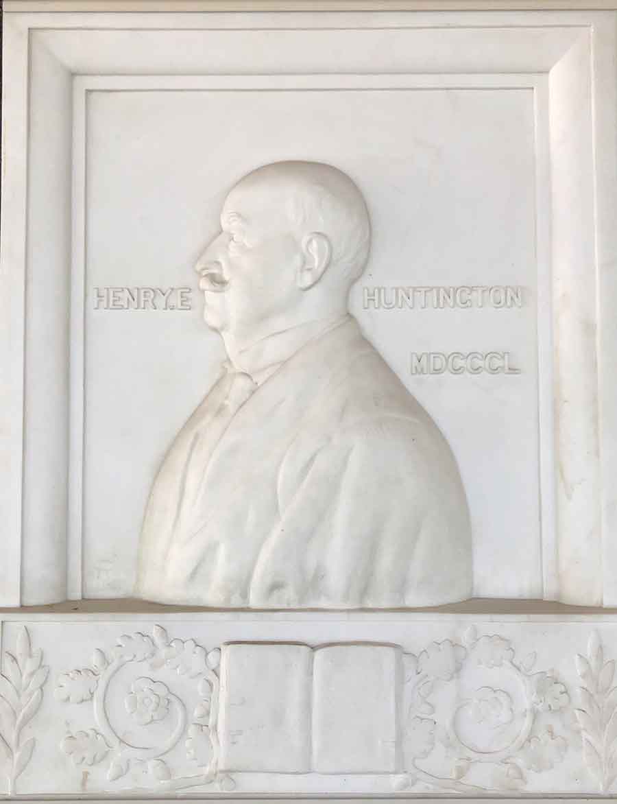 Clara Huntington’s marble bas-relief sculpture of Henry E. Huntington. The Huntington Library, Art Museum, and Botanical Gardens.