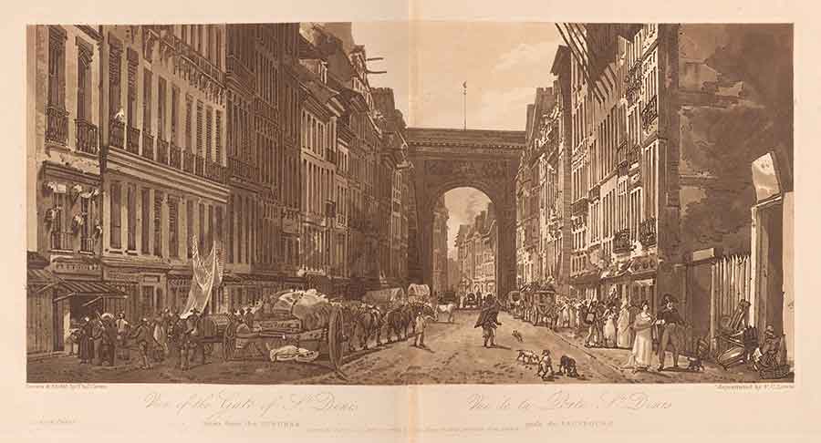 Thomas Girtin, “View of the Gate of St. Denis,” etching and aquatint, plate 10 from A selection of twenty of the most picturesque views in Paris, and its environs drawn and etched in the year 1802 . . . and aquatinted in exact imitation of the original drawings (London: M.A. & J. Girtin, 1803). The Huntington Library, Art Collections, and Botanical Gardens.