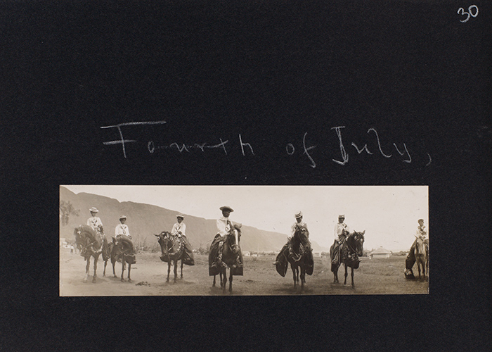 Women Pa’u riders on horseback and wearing traditional costumes, Kalaupapa, Molokai, July 4, 1907. Jack London Collection. The Huntington Library, Art Collections, and Botanical Gardens. Women Pa’u riders on horseback and wearing traditional costumes, Kalaupapa, Molokai, July 4, 1907. Jack London Collection. The Huntington Library, Art Collections, and Botanical Gardens.