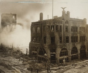 The smoldering ruins of the Times building, morning of Oct. 1, 1910, after bombing by union organizers.