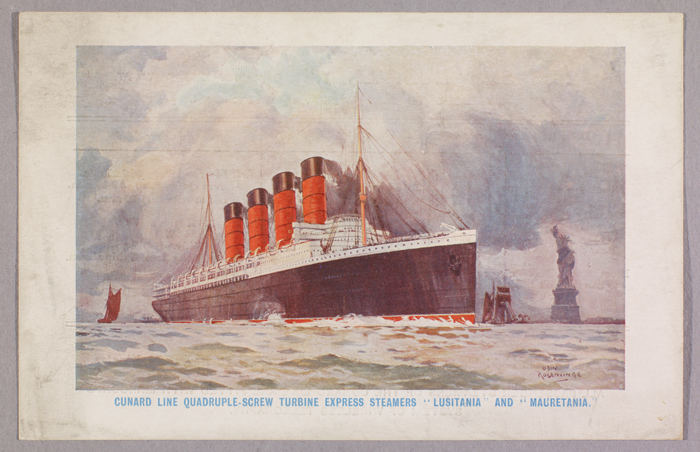 Cunard Line produced this postcard-sized “souvenir log” (1908) depicting the "Lusitania" departing New York Harbor, with the Statue of Liberty in the background. The Huntington Library, Art Collections, and Botanical Gardens.