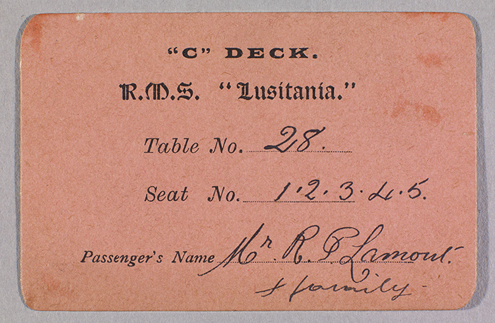 A place card (1914) from the "Lusitania" indicates where a passenger and his four family members should sit. The Huntington Library, Art Collections, and Botanical Gardens.