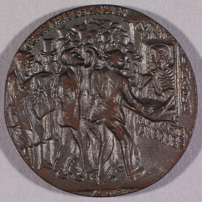 A copy of a medallion (1916) designed in Germany, showing passengers of the "Lusitania" buying tickets from Death. From the author's collection.