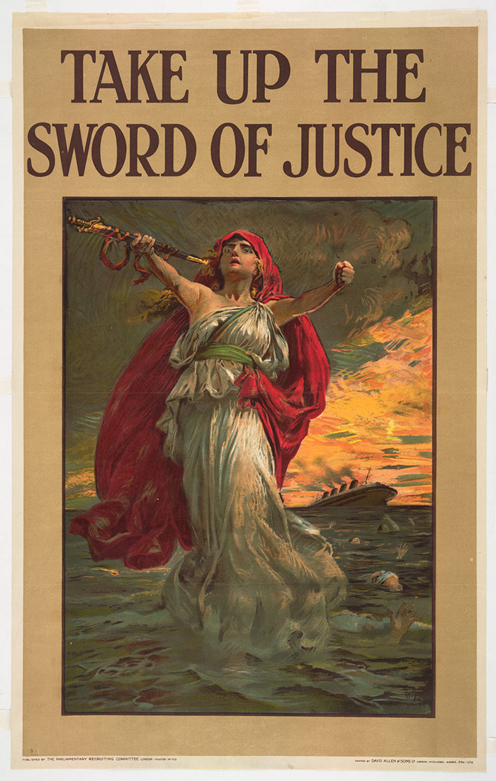 “Take Up the Sword of Justice,” 1915, Bernard Partridge (1861-1945), color lithograph, 40 1/16 x 25 in. The Huntington Library, Art Collections, and Botanical Gardens.