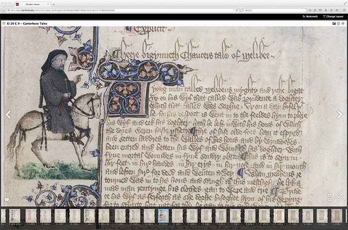 The Huntington’s Ellesmere manuscript of Chaucer’s Canterbury Tales, open to the first lines of “The Tale of Melibee,” as seen through the Mirador viewer. Along the bottom of the screen, you can see each image of the individual pages that comprise the volume. This feature makes it easy to scroll through images and zoom in on particular  passages or illustrations.