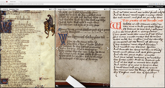 This screen-shot lines up the prologue to The Knight’s Tale from three copies of The Canterbury Tales. The image on the left is from The Huntington’s Ellesmere Chaucer; the image in the middle is from the Hengwrt Chaucer at the National Library of Wales; and the image on the right is from a late-15th-century version of The Canterbury Tales at the Fondation Martin Bodmer in Cologny, Switzerland.