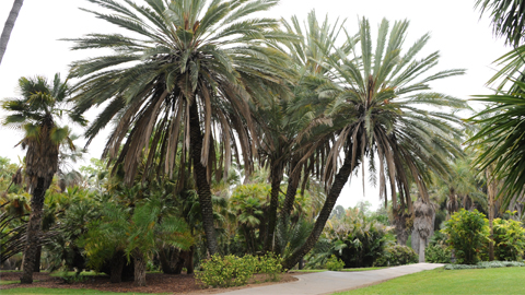 To the surprise of some, there is a multi-trunk date palm specimen at The Huntington, right in the middle of the Palm Garden near the new path. And several of its relatives, other members of the genus Phoenix, are common here and elsewhere. Just inside the Gardens entryway are two large clumps of the Senegal date palm, Phoenix reclinata, a recumbent octopus of a plant that takes more space than many home gardeners are able to allow. Most common in the Southern California landscape is the Canary Island Date Palm, Phoenix canariensis, the thick-trunked, large-crowned pinnate-leaved palm of our roadsides. But in the last couple of decades there has been a quiet revolution as the pygmy date palm, Phoenix roebelinii, has moved from interior mallscapes to becoming a common element in regional landscapes, probably outnumbering its beefier cousin. It is worth noting that we will be adding more real date palms to the landscape in the future. As we reconsider the entry experience for visitors, the palms along the road through the orange groves recall the ranch, and the idea emerges to bring additional palms, probably date palms, into the landscape we are developing for the visitors' center. Of course, if we want dates, we'll have to include both male and female plants, as these trees are unisexual. Perhaps this will give us the chance to say a little more about their lifestyles and their importance.