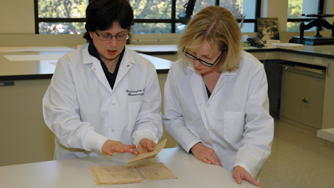 Curator Olga Tsapina (left) consults with Chief Preservation Officer Holly Moore, who found the manuscript to be in excellent condition. Photo by Lisa Blackburn.