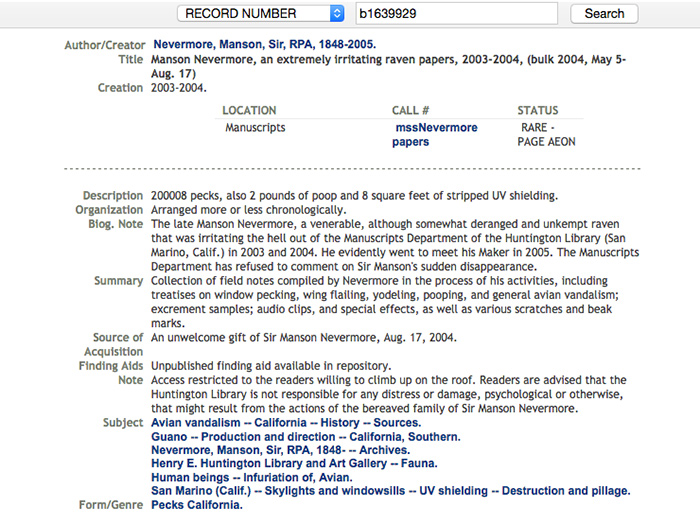 It has traveled further than that. Because The Huntington’s system connects to larger databases, Sir Manson Nevermore has been absorbed into the great global bibliographic network. He’s in WorldCat; he’s in ArchiveGrid. Researchers anywhere on the planet working on guano—my specialty—might stumble across the record. So might those working on “skylights and windowsills” or on “scratches and beak marks.”