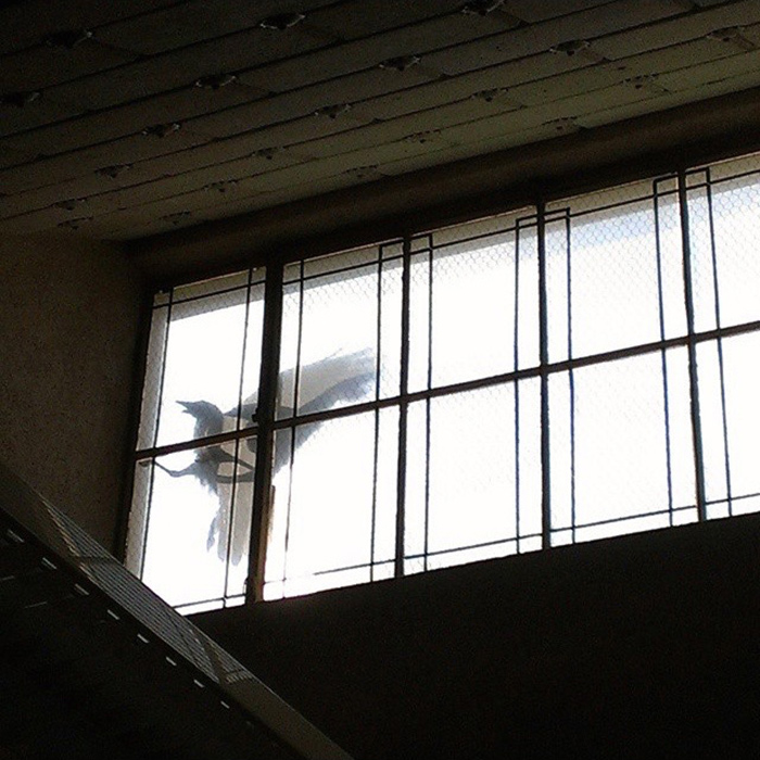 A bird that appears to fit Sir Nevermore’s description flails its wings against a Library window in 2015. Photo by Melissa Lo.