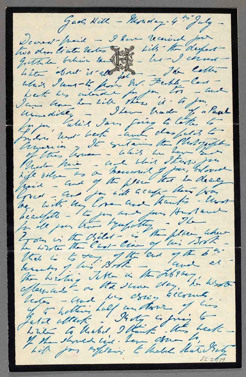 First page of a letter from Georgina Hogarth, sister-in-law of Charles Dickens, to Annie Adams Fields, July 4, 1870. The Huntington Library, Art Museum, and Botanical Gardens.