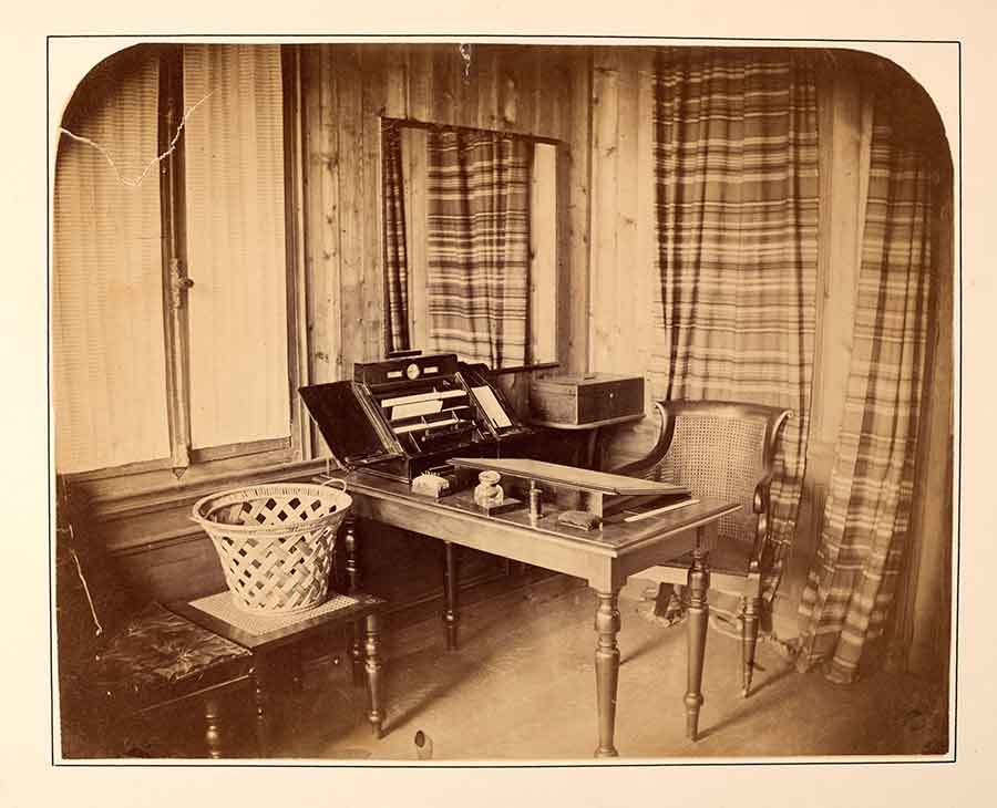 The mirrors around the chalet also allowed Dickens to “perform” his characters, as explained by his daughter Mamie. Significantly, there are no books in the chalet, and only a small chair and stool. And, unlike in his Gad’s Hill study, the desk does not face toward a window but into the room itself, with full view of the mirrors. Once we know that Dickens acted out his characters, this set-up makes sense, but it challenges Dickens’s respectability in Victorian terms.
