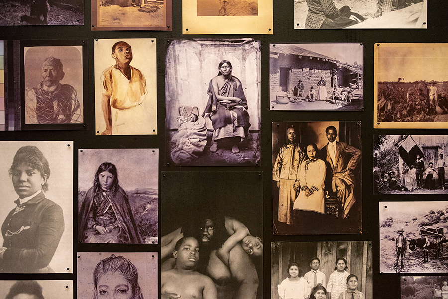 A detail of Caycedo’s three-panel screen, To walk in the present looking forward towards the past, carrying the future on our back / Caminar por el presente mirando de frente hacia el pasado, cargando el futuro en nuestra espalda, 2018, including portraits of African American, Native American, and Mexican men, women, and children. In the middle image on the bottom row, an African American man and his young sons embrace, skin to skin, finding home in one another. The man is Willie Middlebrook (1957–2012), a friend of the photographer Laura Aguilar (1959–2018), who supported and influenced Aguilar’s development as a photographer. Photo by Kate Lain.