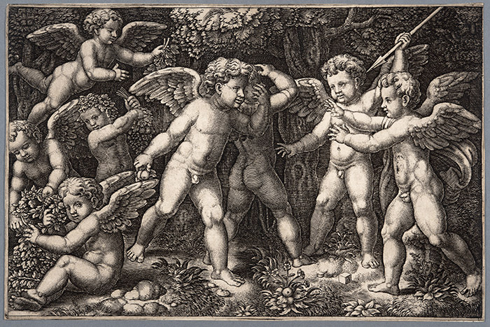 Inspired by the demonic infants sprawling across ancient Roman sarcophagi, Florentine Renaissance artists employed the putto as an ornamental framing device that could animate an artwork. Putti soon took center stage, as in Putti Playing, an engraving executed by the 16th-century printmaker known as “Master of the Die” after a work by Raphael. The print reproduces an unrealized design for tapestries in the Vatican’s Sala di Constantino. The bodies of these boys, eight in total, are adult in their muscularity. They enact an allegorical scene symbolizing the power of love.