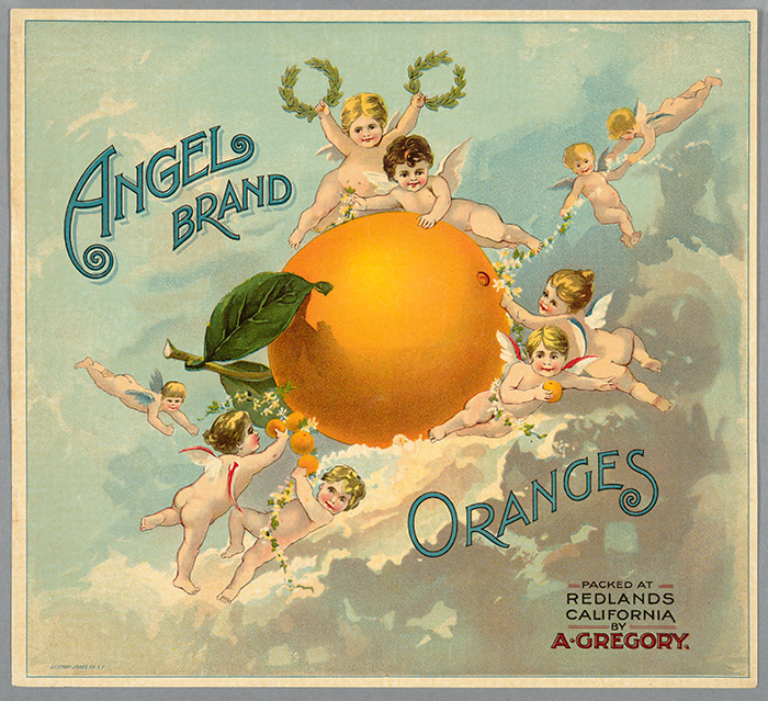 Unknown artist, Angel Brand (advertisement for oranges), colored lithograph, 1900, 25.08 x 27.62 cm. Jay T. Last Collection. The Huntington Library, Art Collections, and Botanical Gardens.