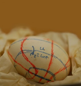 The egg itself is a hollowed-out chicken egg marked with three different colors: red, blue, and black. Near the red and blue lines there are equations written in the corresponding color. Under the egg there are tissue papers as well as an Italian newspaper from 1925. Eggs have many interesting geometrical and physical properties, but it's unclear which of these made an egg the best model for Volterra.