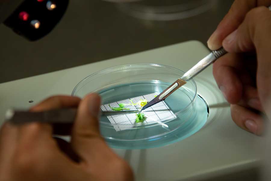 Delgado dissects a shoot tip from an Agave cerulata plant in The Huntington’s cryopreservation lab. Photo by Deborah Miller.