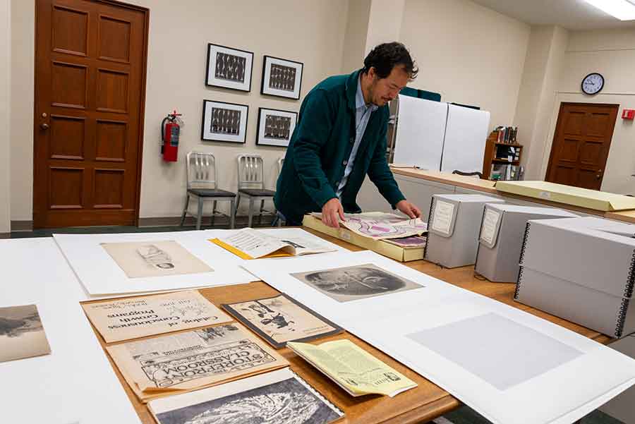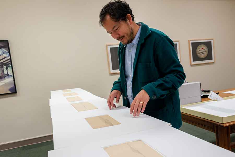 Rosten Woo studies landscape drawings produced during an expedition led by John Russell Bartlett (1805–1886). Bartlett was hired to draw the border between Mexico and the United States after the Mexican American War in 1846. Photo by Kate Lain.