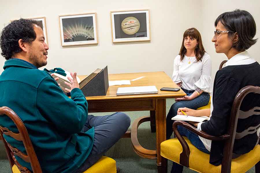 Rosten Woo (left), William A. Moffett Curator of Medieval Manuscripts and British History Vanessa Wilkie (center), and freelance journalist Carribean Fragoza (right) met at The Huntington to Thomas More’s Utopia (1516) and Woo’s desire to create artistic works that help people reorient themselves to place. Photo by Kate Lain.