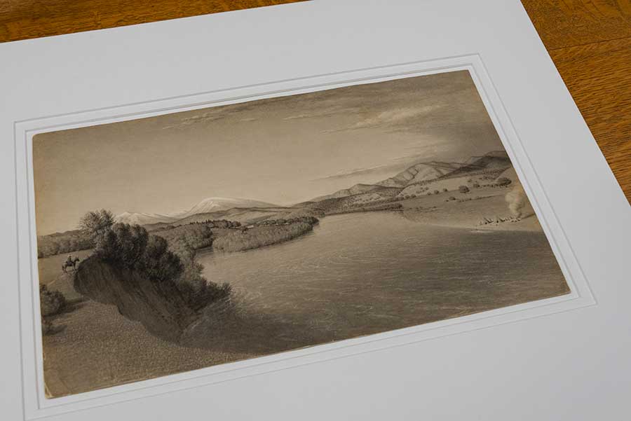John Russell Bartlett hired artists to go along with his expedition to the borderland between Mexico and the United States. This image from the expedition depicts a man on horseback on one side of a river and a camp with a couple of teepees on the other side. Woo sees in it both beauty and a reminder of what will be destroyed. Photo by Kate Lain.