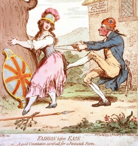 "Fashion before Ease;—or,—A good Constitution sacrificed for a Fantastick Form" (1793), a cartoon by James Gillray (1757–1815) that satirizes Thomas Paine, author of the Rights of Man, who is squeezing Britannia.