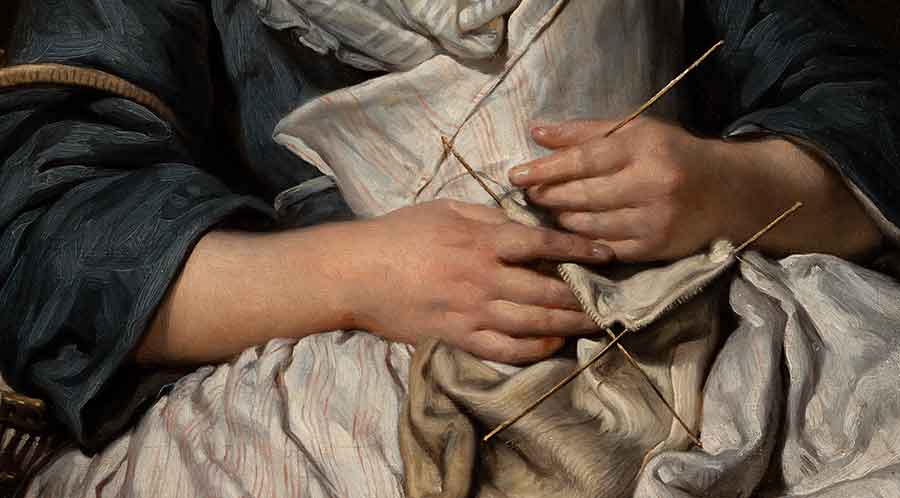 The young girl has fallen asleep while knitting. Her hands loosely hold the four fine needles required to create the enclosed shape of a stocking, whose toe curls in her lap. Jean-Baptiste Greuze, detail of Young Knitter Asleep, ca. 1759, oil on canvas, 27 x 22 in. Adele S. Browning Memorial Collection, gift of Mildred Browning Green and Honorable Lucius Peyton Green. The Huntington Library, Art Museum, and Botanical Gardens.